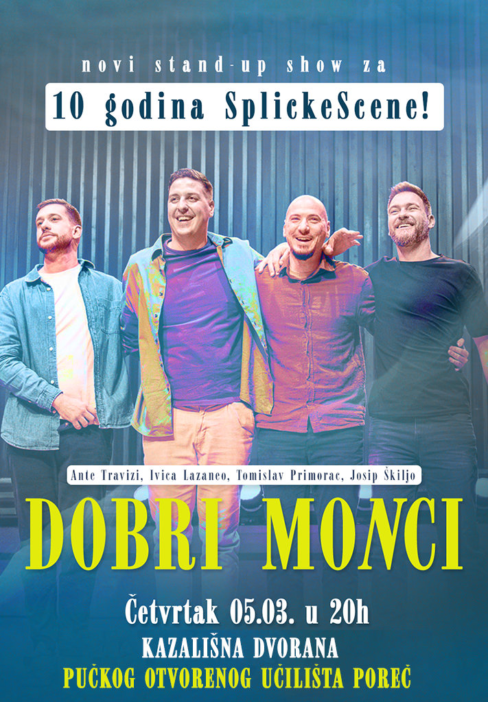 "Dobri monci" je novi show SplickeScene. Monci su stvarno dobri, a ni show nije za bacit. U stvari ovo je lažan marketing. Jebi*a, moraš tako počet, jer ko bi inače platija kartu? Istini za volju, show je stvarno nov, to stoji, al' monci nisu dobri. Dapače. Skoro pa nisu ni monci. Također, za razliku od njih show je dobar. Izvedba je selekcija najboljeg materijala prošle sezone. Show bi, da bi naziv bija u suglasju s činjeničnim stanjem triba nosit naziv "Dobar show, al' blago rečeno, ne osobito dobri monci". Međutim to je predugo za marketinške svrhe te promociju izvedbe pa smo našli kompromis i skratili na dio koji nam paše. 'Ko su dotični monci? Tomislav Primorac, Ivica Lazaneo, Ante Travizi i Josip Škiljo. Nazlov je takodžer zahvalam zaprivlaćenje jezićnih strućljaka koji če nas isporavljat u komentarina i tako gurat algoritan. Unaprid zafaljujemo! SplickaScena ("dobri" monci)